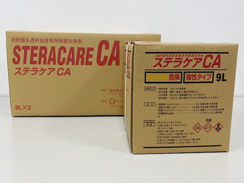 ステラケアCA 従来の過酢酸より各成分濃度を濃くすることにより除菌力、炭酸カルシウム除去力 がアップした薬剤になります。 種類 過酢酸系洗浄剤 主成分 過酢酸 (4%) 過酸化水素 (6%未満) 酢酸 (35.5%) 有機酸性化合物 水 使用倍率 150~350(200倍希釈) 封入時間 推奨一晩封入(最低5時間以上) 水洗時間 60分以上 容量 18L(9L×2本入り) 併用薬剤 2日以上/週の割合でアルカリ洗浄を行ってください 各関連学会発表資料